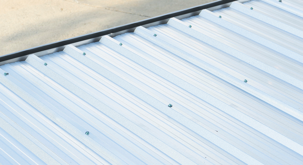 Les plaques sont découpées sur mesure et fixées à l’aide de vis autoperceuses avec cavaliers et joints d’étanchéité néoprène. Chaque point de fixation est calculé pour résister aux pressions du vent.