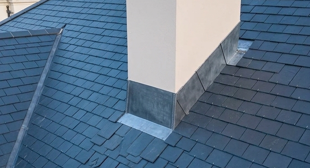 Nous créons une pièce d’étanchéité unique (en zinc, plomb ou cuivre) appelée « solin » avec une bavette souple. Cette pièce est façonnée à la main pour épouser parfaitement la forme de votre conduit et le relief de vos tuiles.